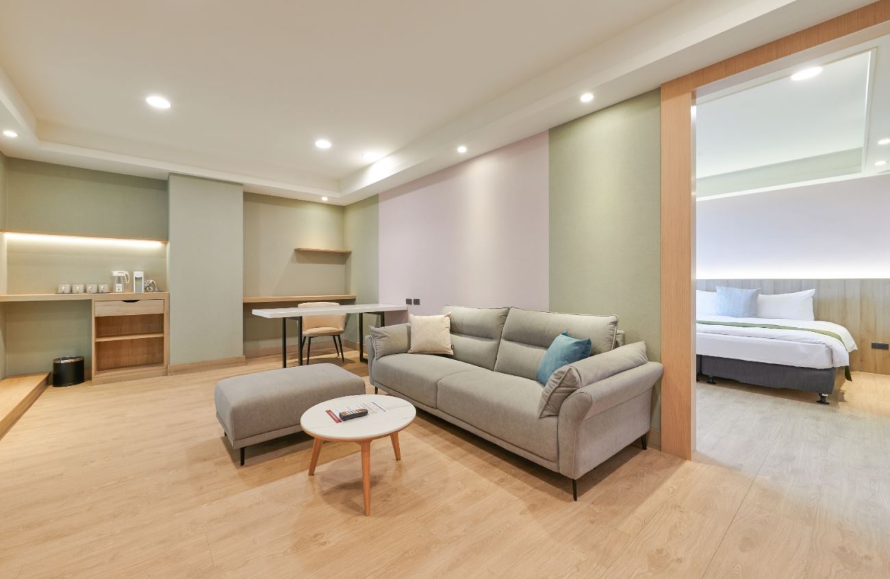 20坪寬敞格局,規劃獨立小客廳與舒適臥眠空間,兩張 180×200cm 雙人床,簡單大方的起居設計,營造沉穩而放鬆的居住氛圍。