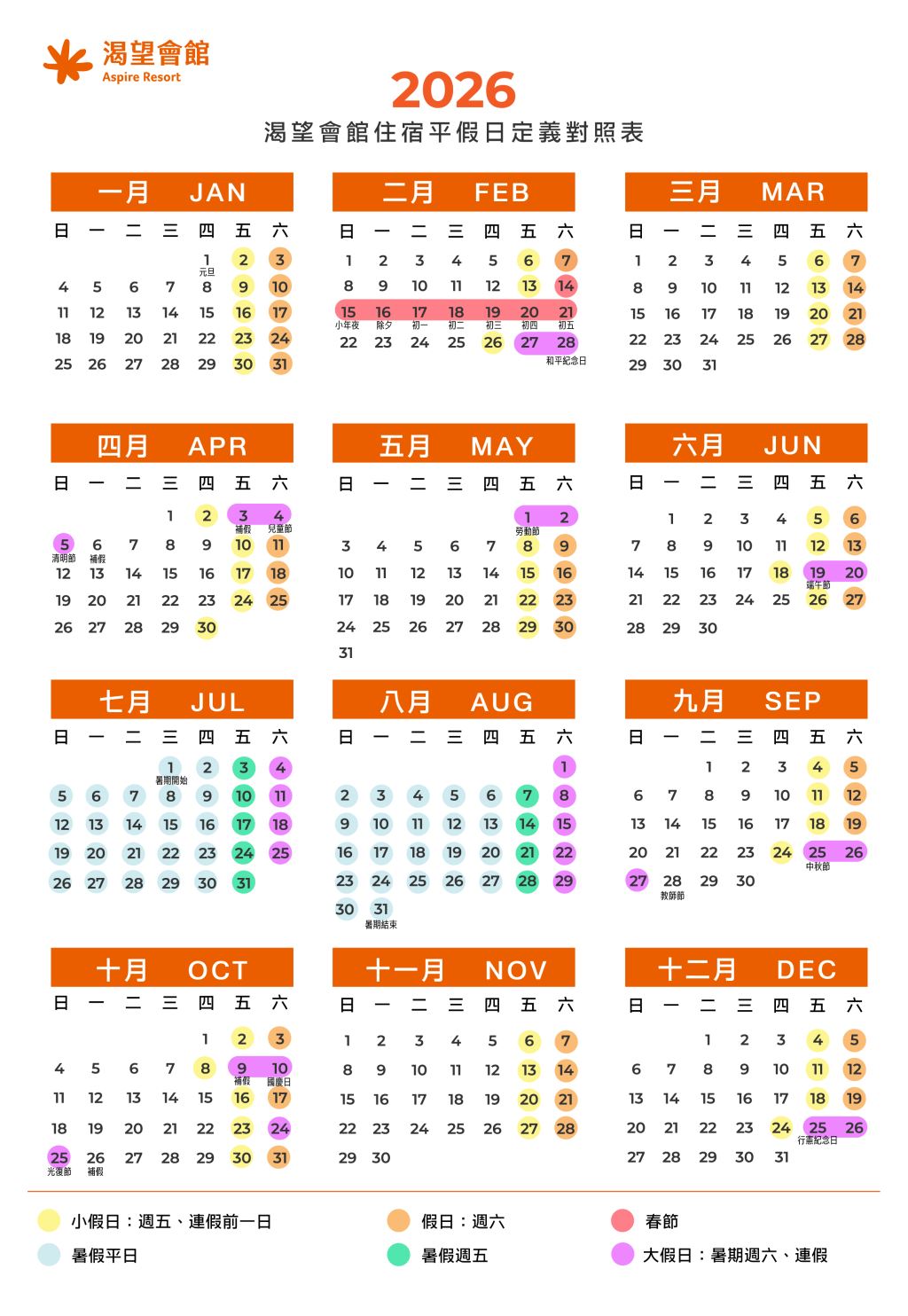 2025/10/01 【公告】2026 渴望會館住宿平假日定義對照表